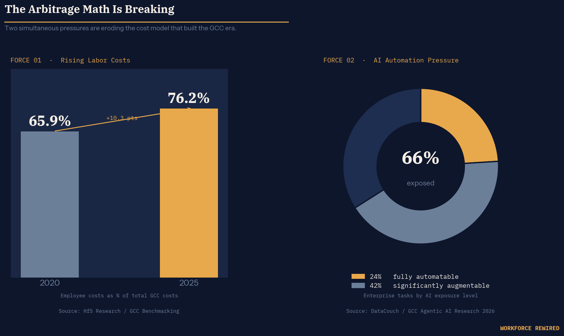 Here is the structural pressure that does not get discussed enough: the cost advantage that anchored the GCC model is eroding from two directions simultaneously.
