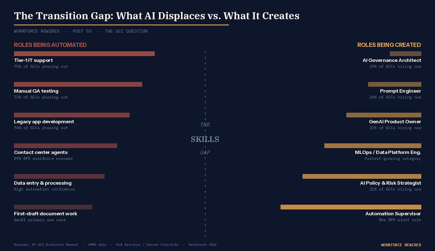 The architecture of knowledge work is being redrawn. Some countries are positioning themselves intelligently. Some companies are managing the transition with genuine care. But the macro-level optimism about GCC transformation does not automatically translate into good outcomes for the people inside those centers whose work is changing faster than their development pathways are.