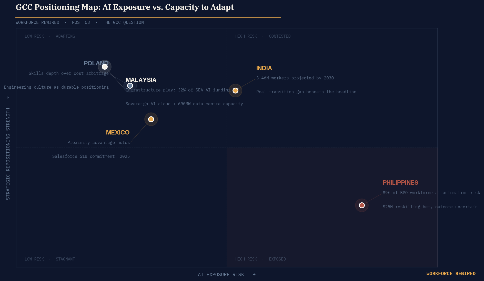 The GCC model is not dying. It is differentiating. The markets that built their positioning on labor cost for routine cognitive work are under genuine pressure, and the speed of their repositioning will determine whether AI displacement is managed as a transition or experienced as a collapse. The markets that built on skills depth, infrastructure control, or proximity advantages are in a more defensible position, though not an invulnerable one.