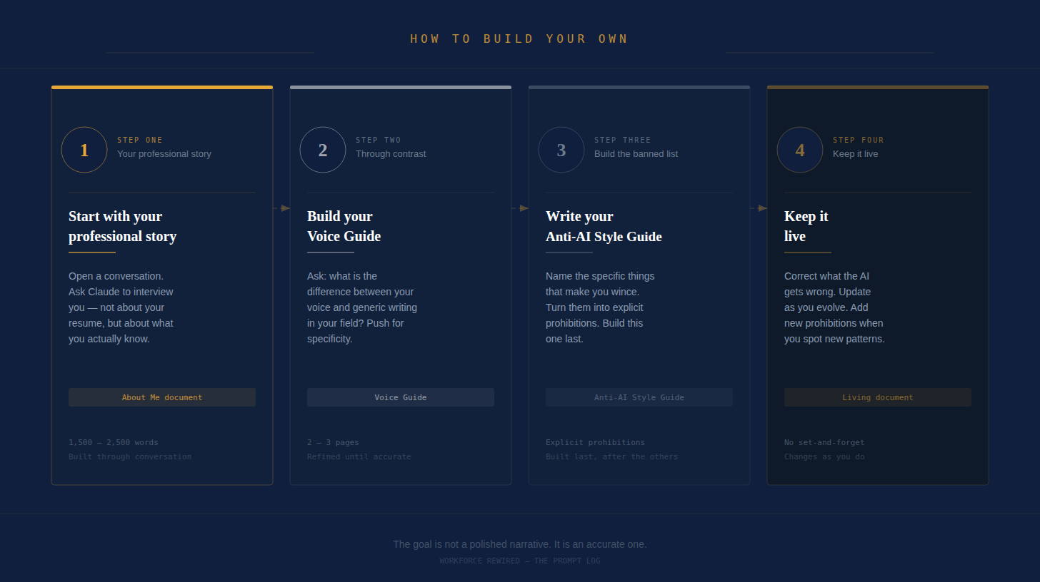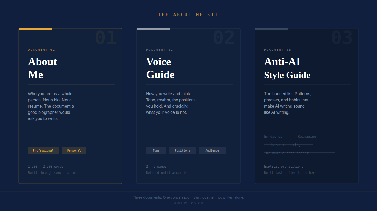 What I ended up with, at the end of those conversations, was three documents: an About Me, a Voice Guide, and an Anti-AI Style Guide. Not drafts I had written. Synthesized outputs the AI produced from our exchange, which I then reviewed, corrected, and refined until they were accurate. The process felt less like writing and more like being interviewed by someone who was also doing the transcription.