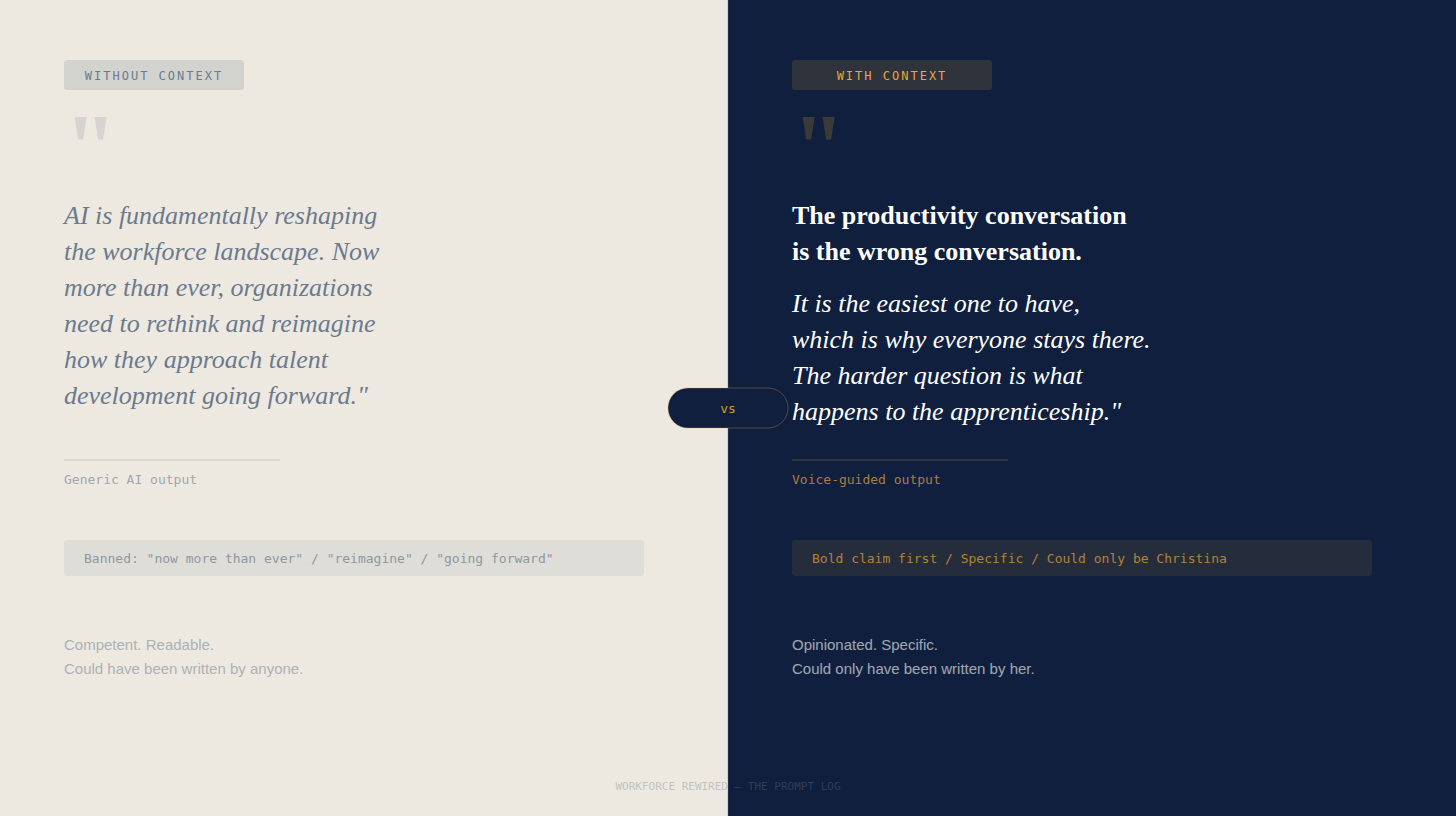 I launched Workforce Rewired several weeks ago and had been working with Claude since before that, building infrastructure, drafting research, setting up the daily briefing system that lands in my inbox every morning. The collaboration was working. But I kept noticing the distance between a first draft and something that actually sounded like me. I was spending real time correcting toward my own voice. That felt like a solvable problem.